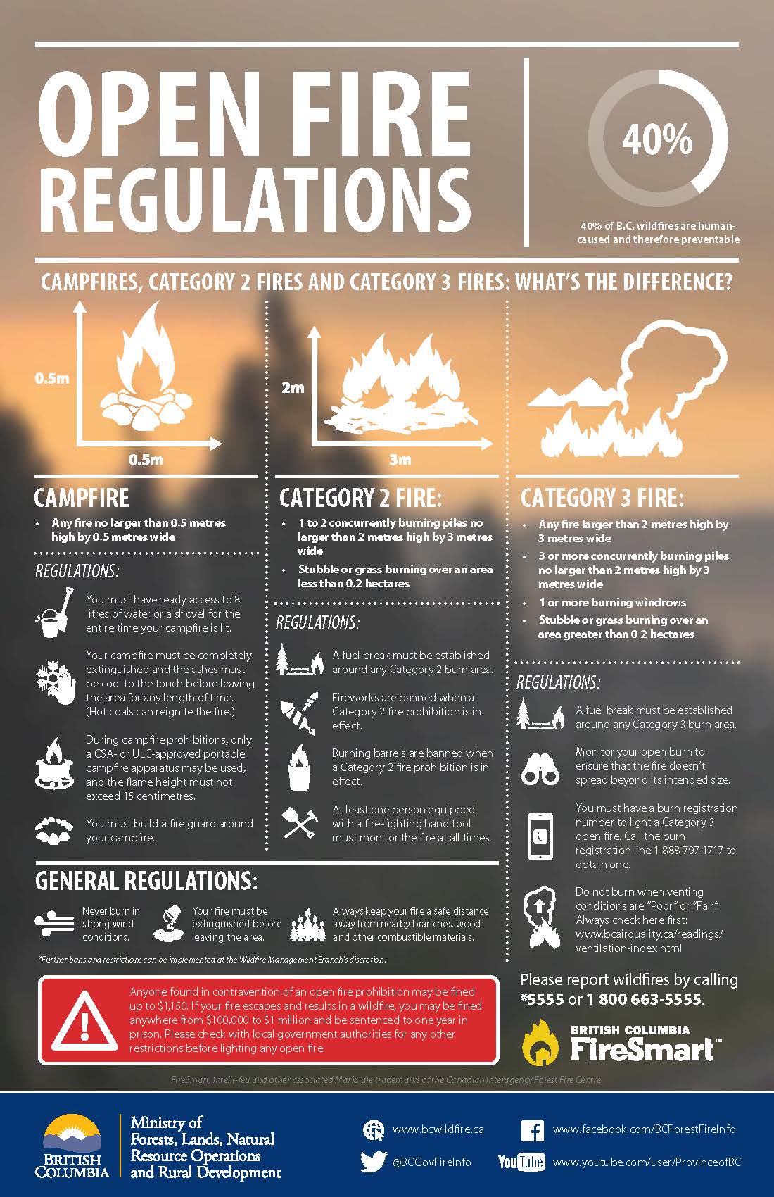 Anyone who lights, fuels or uses an open fire when a fire prohibition is in place or fails to comply with an open fire prohibition may be issued a ticket for $1,150 or, if convicted in court, be fined up to $100,000 and/or sentenced to one year in jail. If the contravention causes or contributes to a wildfire, the person responsible may be subject to a penalty of up to $100,000 and ordered to pay all firefighting and associated costs.