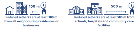 - Reduced setbacks are at least 100 m from all neighbouring residences or businesses. Reduced setbacks are at least 500 m from schools, hospitals, and community care facilities.