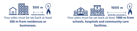 - You must meet setbacks. A setback is the measured distance between your burn pile and the nearest resident, or business (500m); or to a school, hospital, or community care facility (1000m).
